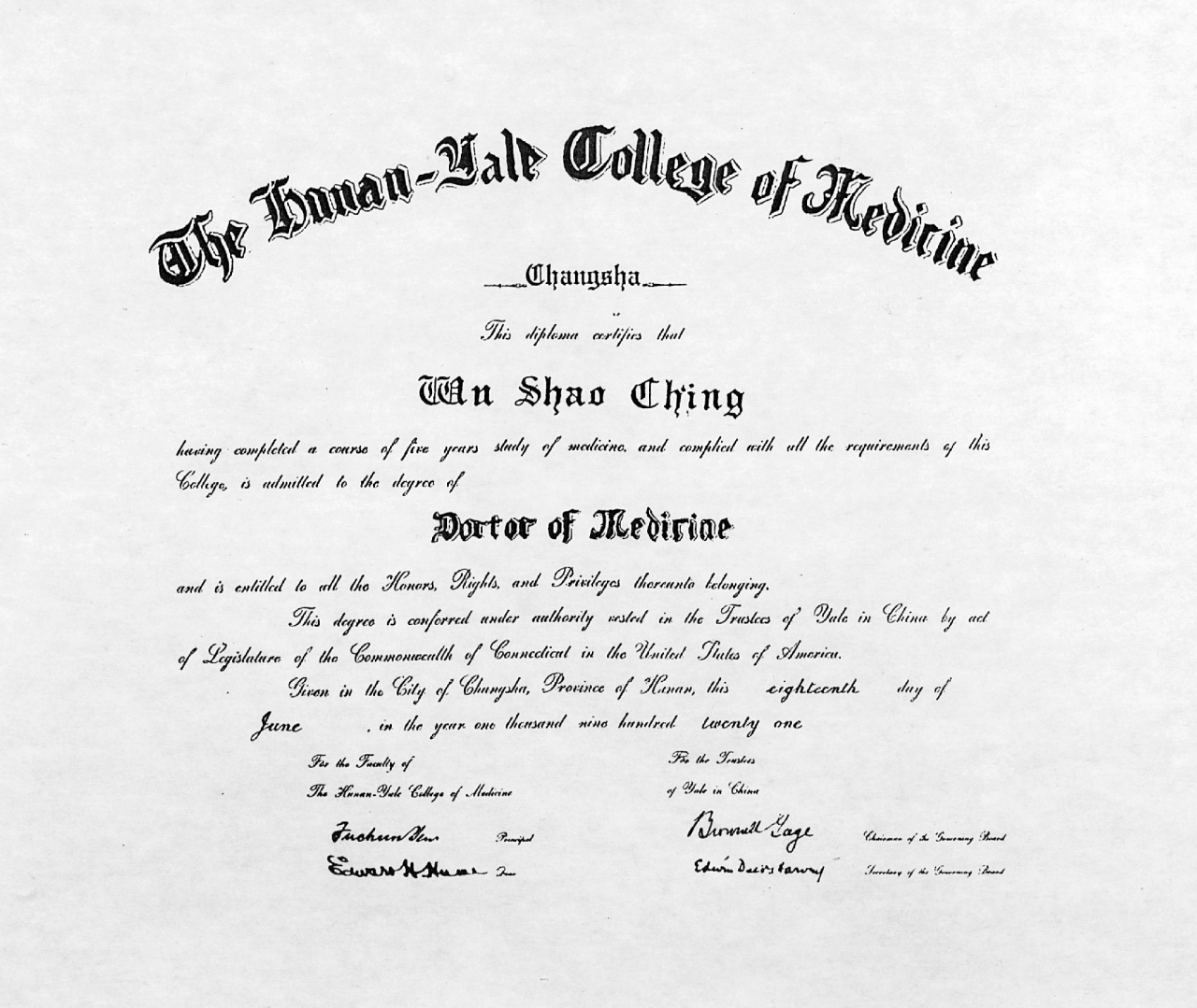 吴绍青出生于清末安徽巢县乡村塾师家庭,幼年失怙,家道清贫,却早立济世之志。1915年插班考入湘雅医学专门学校(今中南大学湘雅医学院),1921年以首届十名毕业生之一的身份获得毕业证书,还获得美国康涅狄格州政府授予的医学博士学位证书,与医学名家张孝骞、应元岳、汤飞凡等日后成为我国医学领域泰斗的同窗共铸一代医魂。