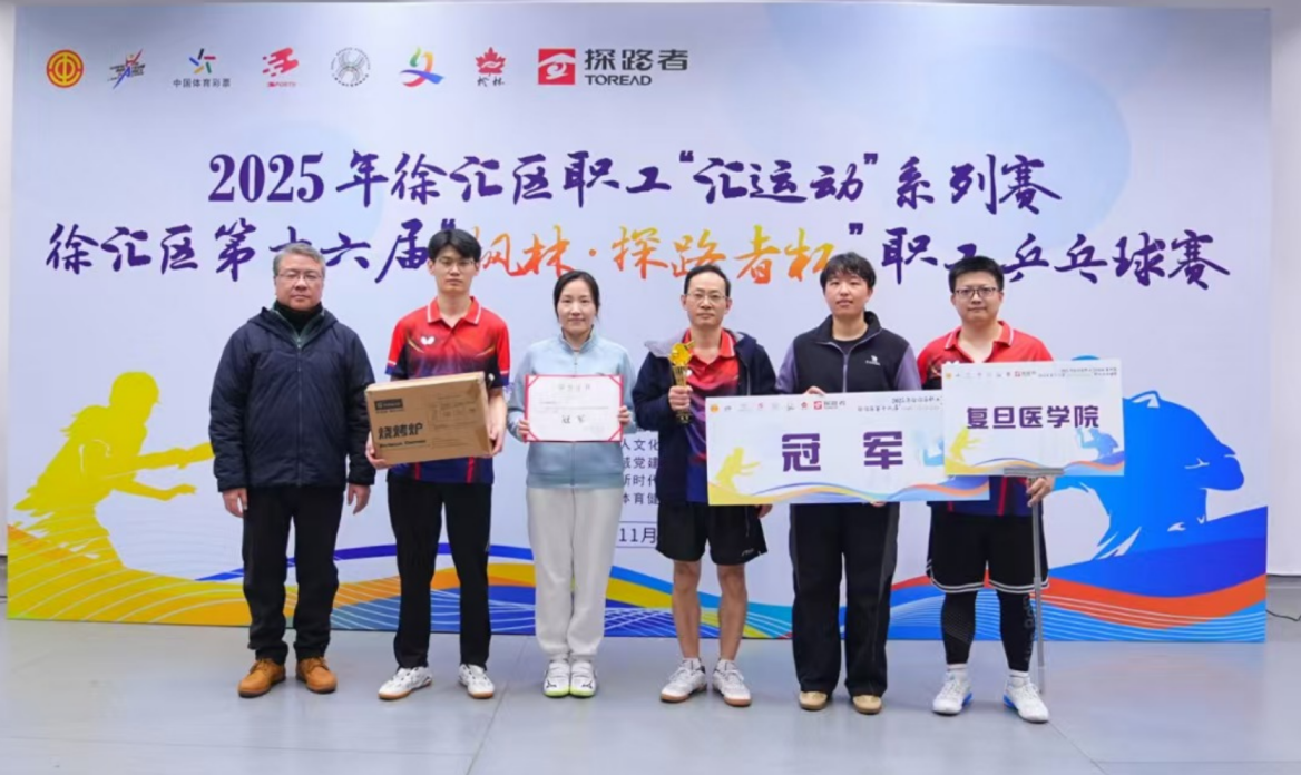 2025年11月29日,由徐汇区总工会指导,枫林街道党工委、办事处主办的徐汇区第十六届“枫林·探路者杯”职工乒乓球比赛在复旦大学上海医学院体育馆圆满落幕。经过激烈角逐,复旦大学上海医学院代表队(后文简称“复旦上医代表队”)凭借出色的团队协作与顽强拼搏的精神,一路过关斩将,最终摘得男女混合团体赛冠军,为学校及徐汇区医务系统赢得荣誉。