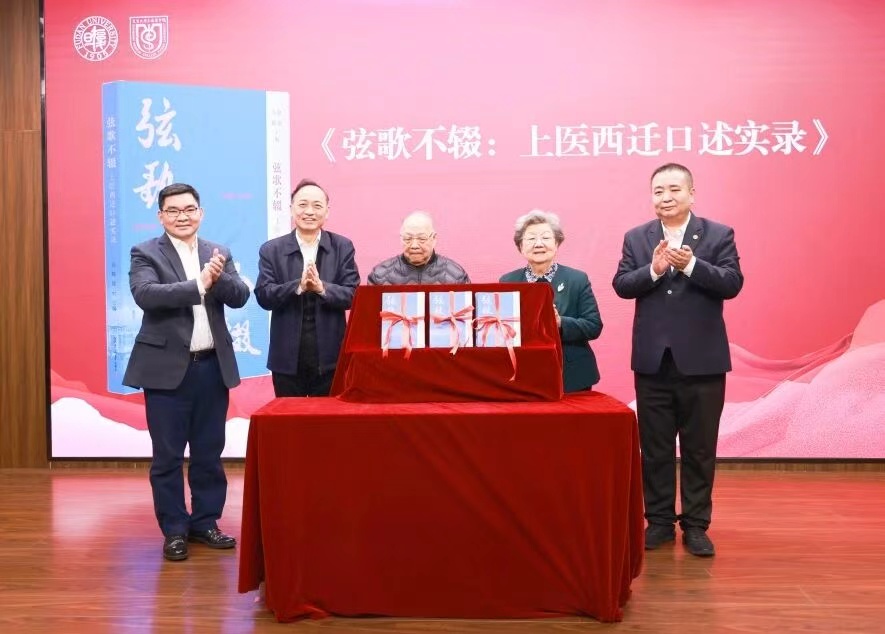 《弦歌不辍:上医西迁口述实录》首发仪式在座谈会上举行。金力、董为伟、左焕琛、袁正宏、袁军等领导专家共同为新书揭幕。