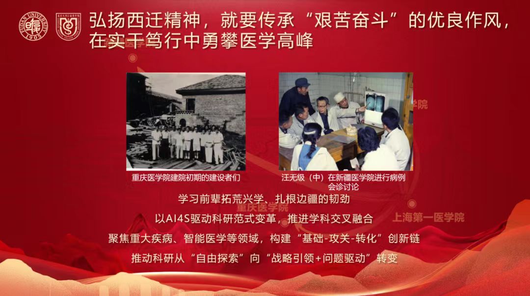 三要传承“艰苦奋斗”作风,学习老一辈西迁人在艰苦条件下拓荒兴学的精神、“啃硬骨头”的勇气和“钉钉子”的韧劲,在科研探索上实现引领性突破,以AI4S驱动科研范式变革,构建“基础研究-技术攻关-临床转化”创新链条,在实干笃行中勇攀医学高峰。