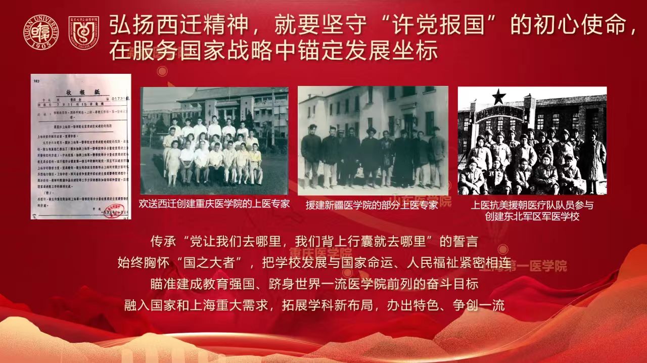 四要厚植“携手前行”情谊,以传承西迁精神为纽带,延续上医与重医、新医等兄弟院校之间血脉相连、休戚与共的深情厚谊,深化校际拔尖医学人才培养、重大科研项目攻关、疑难杂症协同诊疗、医学教育资源共建共享、医学人文交流互鉴等领域合作,助力区域协调发展。