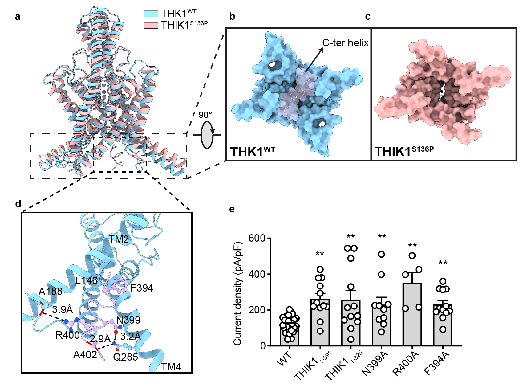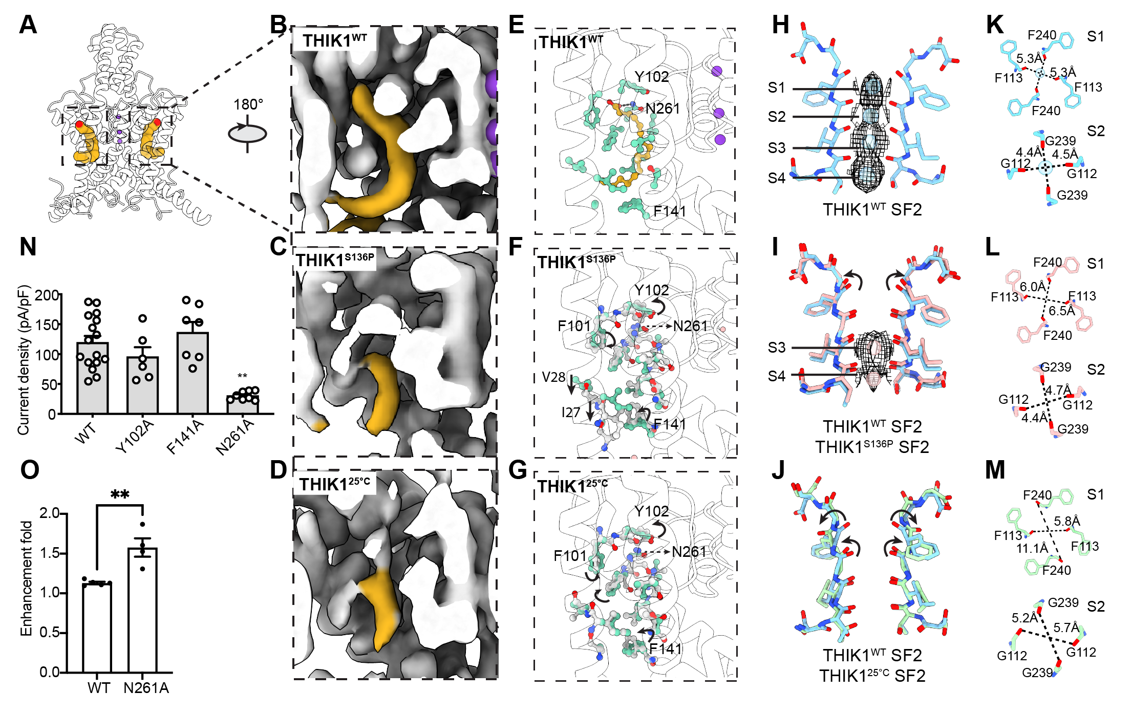 该研究解析了人源全长THIK1野生型(THIK1WT)和S136P(THIK1S136P)突变体的冷冻电镜结构,两个结构分辨率分别为2.7 Å和3.1 Å。THIK1具有K2P典型的结构特征,通道由两个亚基组成,每个亚基包含四个跨膜螺旋片段 (TM)和两个孔形成模序,其中孔形成模序构成K2P的钾离子选择性过滤器 (SF)。值得注意的是,THIK1展现出一系列不同于其他 K2P的结构特征与门控机制。THIK1内部存在两个控制钾离子运输的门控开关。其中一个开关位于选择性过滤器下方,由一对酪氨酸残基(Tyr273)构成,其空间位阻,限制了 SF下方的钾离子传导通路。而在THIK1胞内前庭的下方,有一对C末端短螺旋封闭了胞内前庭的入口并阻碍了钾离子的传导。THIK1S136P的结构和电生理实验表明,THIK1的C末端可以直接作为胞内门响应各种生理刺激,可能涉及caspase 8的切割和G蛋白的调控。