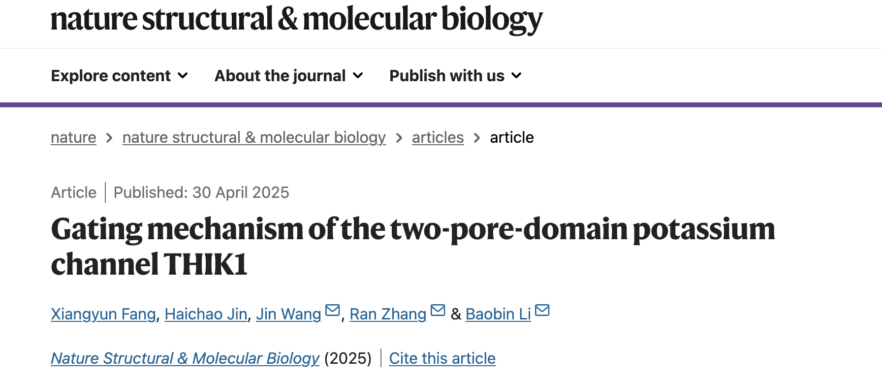 2025年4月30日,复旦大学脑科学转化研究院李保宾课题组联合中国药科大学理学院汪津课题组在Nature Structural & Molecular Biology杂志发表题为“Gating mechanism of the two-pore-domain potassium channel THIK1”的研究论文,报道了双孔钾离子通道THIK1及其突变体的高分辨率冷冻电镜结构,并结合全细胞电生理实验和分子动力学模拟揭示了THIK1的离子运输机制和独特的门控机制,为开发靶向THIK1的调节剂奠定基础。