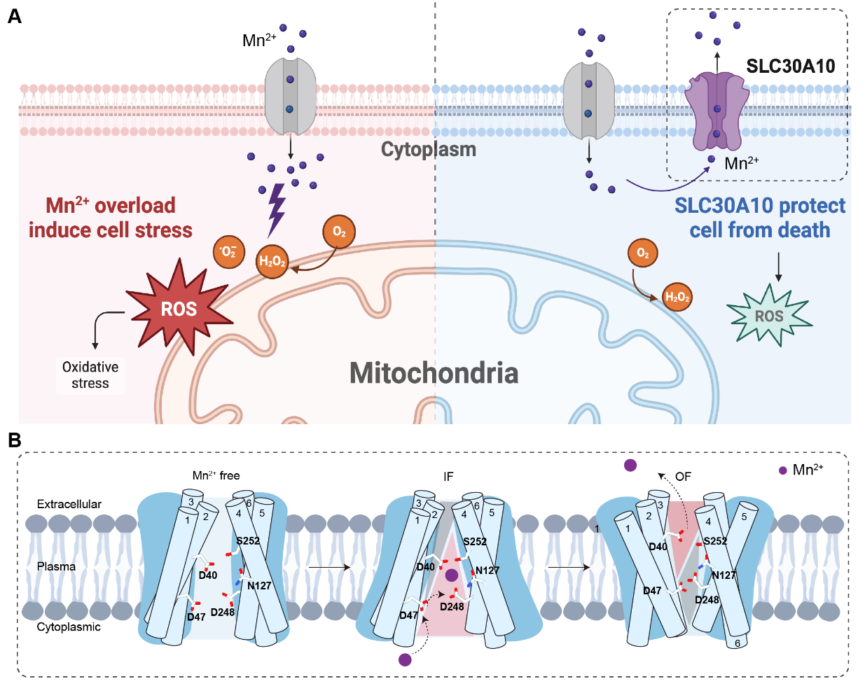 锰(Mn)是人体必需的微量元素,参与蛋白质合成、能量代谢、抗氧化应激和神经系统发育等关键过程。然而,Mn2+过量会损害高尔基体、内质网等细胞器功能,干扰蛋白折叠、翻译后修饰、细胞内运输与降解;同时通过破坏氧化磷酸化并增加活性氧(ROS)生成,诱发线粒体功能衰竭与细胞死亡。SLC30A10(solute carrier family 30 member 10,溶质载体30家族成员10,又称 ZnT10)是维持细胞锰稳态的核心跨膜转运体,主要分布于脑部和肝脏等部位,能够特异性介导锰离子外排,从而降低细胞内锰水平。SLC30A10 基因突变会导致常染色体隐性遗传病HMNDYT1(高锰血症合并肌张力障碍-1 型,hypermanganesemia with dystonia-1),患者表现为类帕金森病的运动和语言障碍、肝损伤等症状。探究SLC30A10的转运机制不仅对阐明其生理功能至关重要,且有助于发现靶向SLC30A10的调节剂,有望治疗与其相关的HMNDYT1等神经系统疾病。