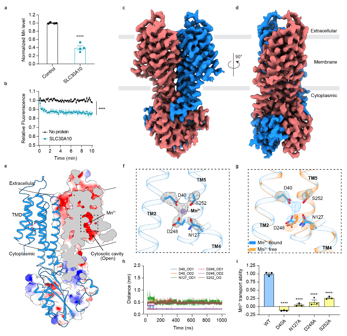 该研究发现,SLC30A10在Mn²⁺过载条件下通过介导Mn²⁺外排,缓解细胞的氧化应激并维持线粒体稳态和细胞活性。结合细胞与蛋白水平的离子转运实验,证实了SLC30A10对Mn²⁺具有高度选择性。为进一步理解其转运离子的分子机制,研究团队利用冷冻电镜技术解析了全长人源SLC30A10的高分辨率结构,揭示了其同源二聚体的整体构架。SLC30A10每个单体包含具有6次跨膜螺旋的跨膜结构域(TMD)及细胞质C末端结构域(CTD)。值得注意的是,通过对比结合Mn²⁺和不含Mn²⁺条件的结构,团队观察到Mn²⁺与D40(TM2)、N127(TM4)、D248(TM5)、S252(TM5)形成似八面体配位,这是首次在该家族发现的Mn²⁺特异性结合位点,不同于ZnT家族其他锌转运蛋白的离子结合特征。结合针对Mn2+转运关键位点突变体细胞实验,揭示了其在Mn²⁺转运及线粒体稳态维持中不可或缺的关键作用。