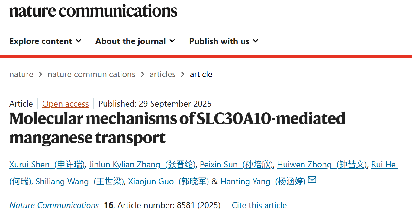 2025年9月29日,脑科学转化研究院杨涵婷课题组在Nature Communications上发表了题为“Molecular Mechanisms of SLC30A10-Mediated Manganese Transport”的研究论文,在分子水平阐明了SLC30A10介导锰离子外排的机制及其在缓解锰毒性中的关键作用,为常染色体隐性遗传病HMNDYT1等神经系统疾病的发病机制研究与潜在靶向干预提供了重要理论基础。
