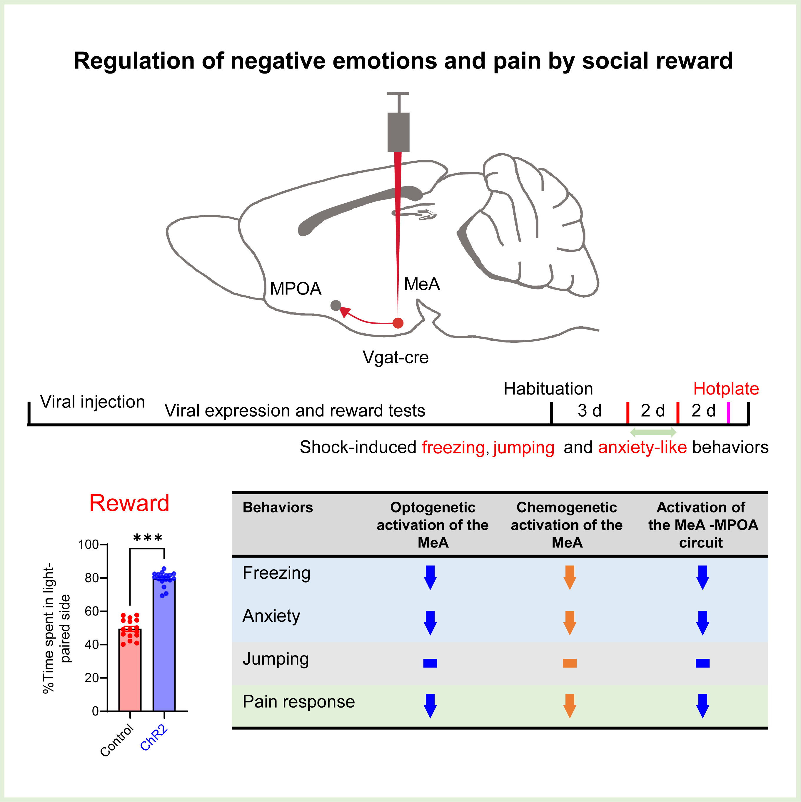 疼痛是一种令人不快的感官与情感体验,常伴随负面情绪状态的产生。疼痛及其后续情绪状态均受到生物、心理与社会因素复杂交织的深刻影响。既往研究表明,源自积极社交互动的社会奖赏与多巴胺、内源性阿片类等神经化学物质的释放相关,而这些物质能降低疼痛敏感性并提升幸福感。相反,负面社交经历或社会隔离则会加剧疼痛与情绪反应,提高感知敏感性,引发适应不良境遇的应对策略,并增加发展为慢性疼痛的风险。然而,社会奖赏相关神经环路如何通过直接调控影响疼痛与负面情绪反应的内在机制仍不明确。内侧杏仁核(medial amygdala, MeA)已被证实参与社会行为调控。我们近期的研究进一步揭示了MeA在社会奖赏调控和亲社会行为促进中的关键作用。尽管大量研究将MeA与情绪和疼痛调控相关联,但关于MeA特定神经元亚群及其下游神经环路如何调控情绪状态与疼痛感知的研究尚属空白。因此,本研究通过激活MeA区GABA能神经元及其投射到内侧视前区(MPOA)的神经环路,探究其在疼痛相关行为中的作用。