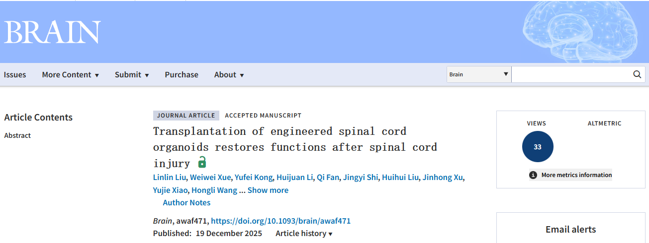 2025年12月19日,复旦大学脑科学转化研究院邵志成团队联合空军军医大学武胜昔教授在国际著名期刊Brain上发表了题为“Transplantation of engineered spinal cord organoids restores functions after spinal cord injury”的研究论文,在该方向取得了重要突破。这项研究不仅首次证实了基于工程化材料支撑的脊髓类器官在修复完全性脊髓损伤中的可行性与有效性,也为未来开发用于临床的“人工脊髓组织”提供了关键理论基础与技术储备。同时,该研究所构建的具备复杂结构与功能的大型类器官模型,也为研究神经发育、脊髓疾病机制及药物筛选提供了重要的实验平台,推动了神经再生医学与类器官领域的发展。