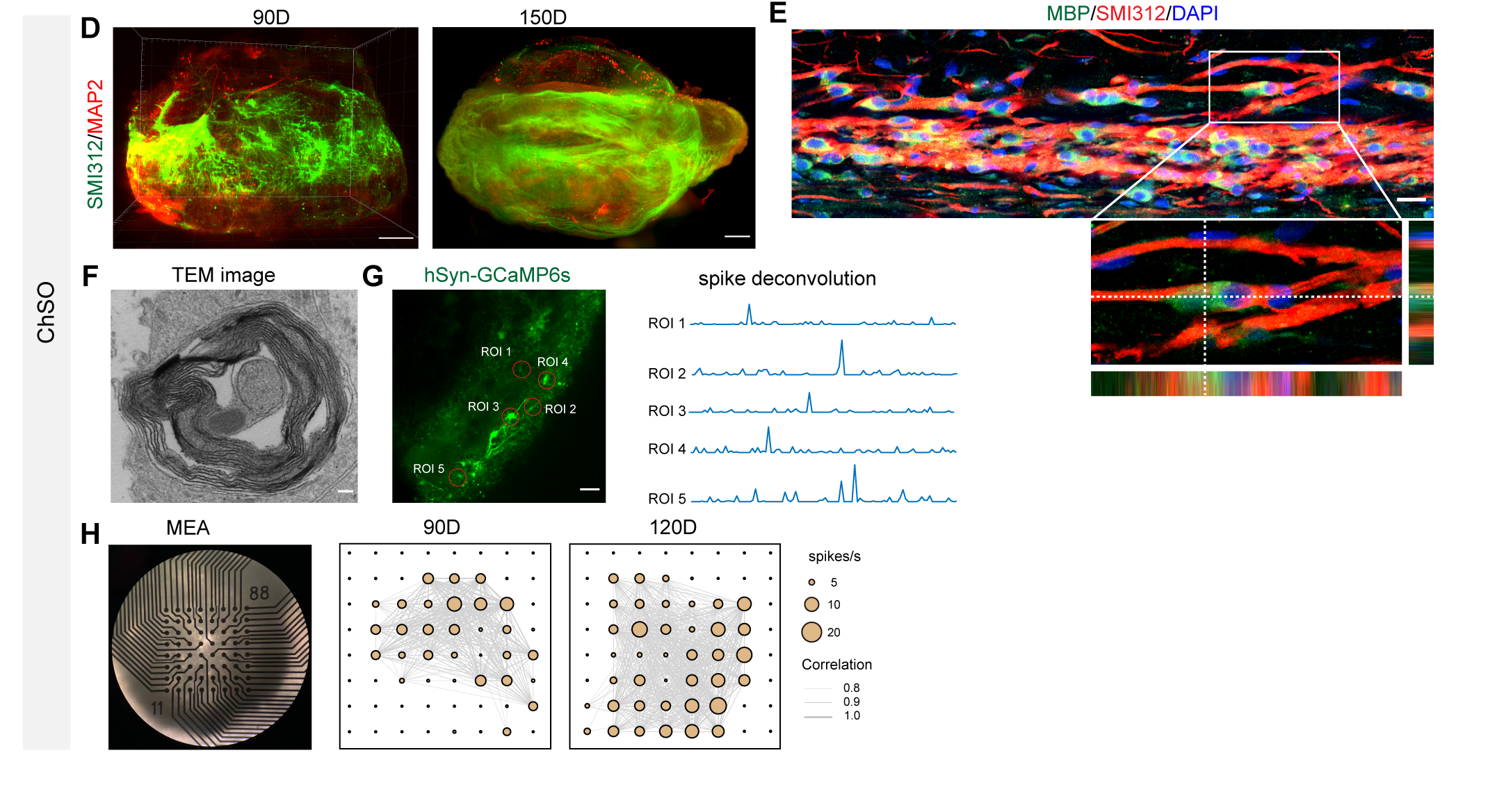 长期培养的工程化脊髓类器官(ChSO)展现出惊人的结构成熟与功能整合能力。它们能自发延伸出定向排列的轴突束,并实现包裹轴突的髓鞘化,模拟了体内神经纤维的传导结构。在此基础上,这些类器官进一步形成具有同步化电活动的神经网络,表现出复杂的自发放电、突触传递甚至节律性振荡,成功重现了成熟脊髓组织的关键电生理功能,为研究神经环路发育和损伤修复提供了高度仿生的体外模型(图2)。