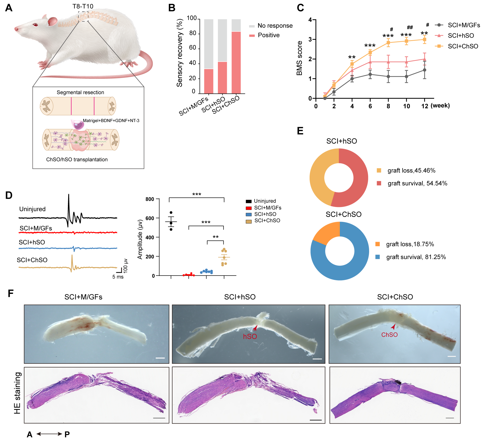图4.工程化脊髓类器官(ChSOs)与传统类器官(hSOs)在完全性SCI模型中的存活与功能恢复效果对比