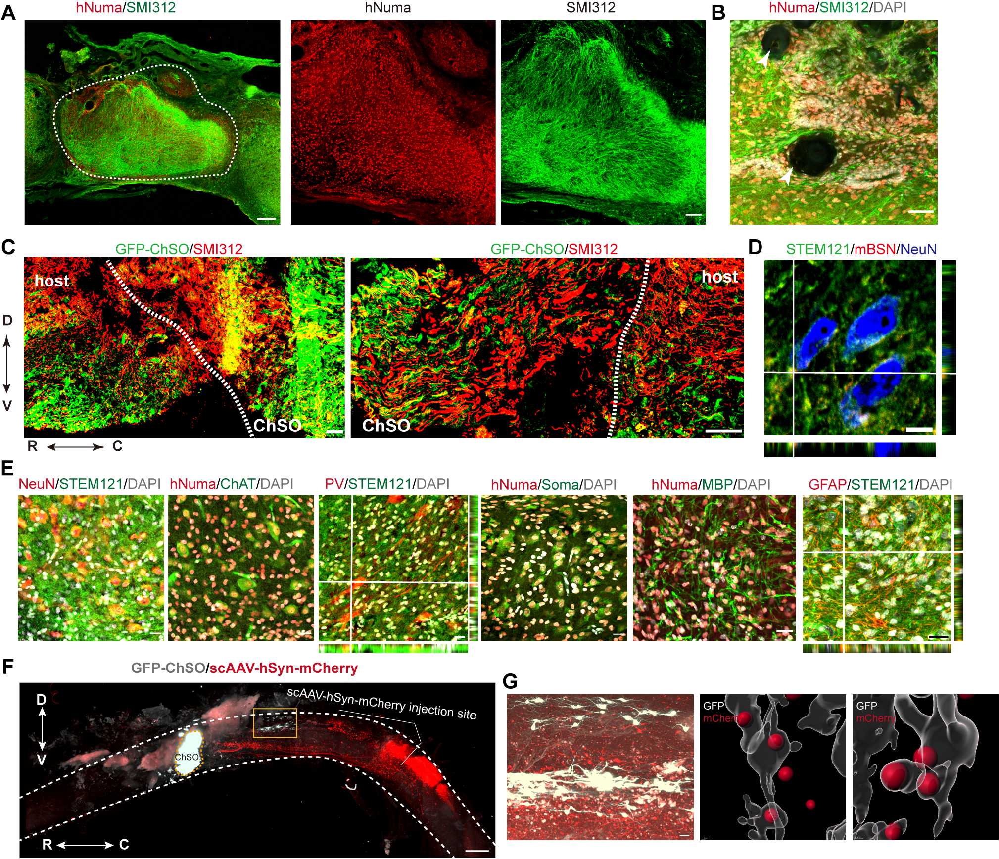 图3. 移植ChSOs在完全性SCI小鼠体内的存活与神经元分化