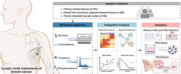“为了进一步揭示乳腺癌淋巴转移的奥秘,破解相关研究难点,团队收集了195例临床样本,涵盖65位乳腺癌淋巴转移患者的原发肿瘤组织、配对的正常组织以及转移的淋巴结组织。”余科达主任说,团队基于临床科学问题,通过对这些样本进行深度的基因、蛋白质及磷酸化修饰等多层面检测分析,系统梳理了癌细胞转移过程中的分子变化规律,成功绘制出乳腺癌原发灶与转移至淋巴结的“分子地图”,并精准标注癌细胞转移至淋巴结的活动轨迹。