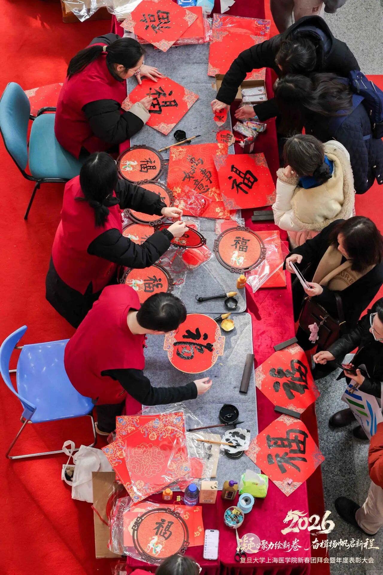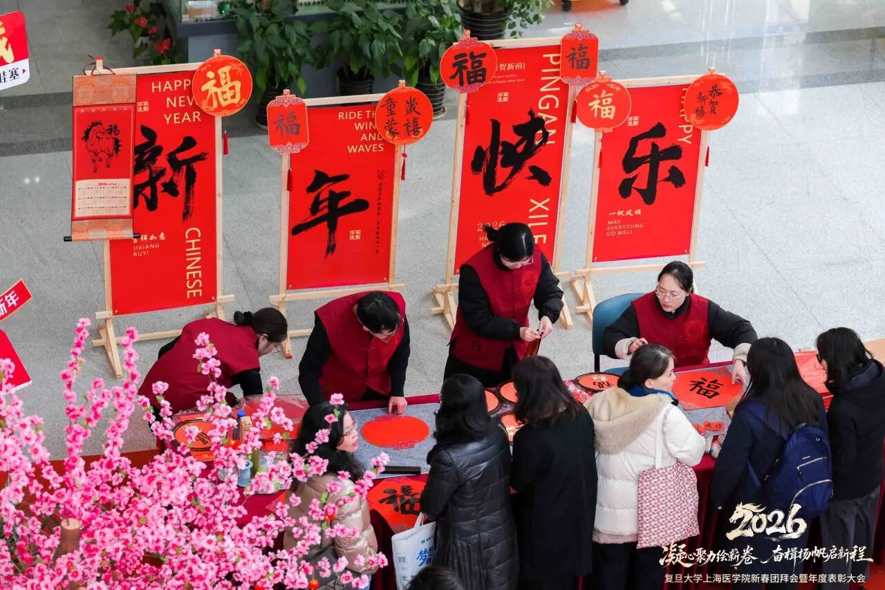 红梅报春,福满枫林。近日,校园内处处温暖祥和,主干道两侧换上了崭新的红色道旗,明道楼会场外灯笼高挂、福字点缀。2026年1月31日下午,复旦大学上海医学院在枫林校区明道楼隆重举行2026年新春团拜会暨年度表彰大会。