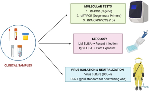 主要依靠病毒核酸检测和血清学抗体检测。医生会重点关注患者的流行病学史(如是否前往疫区、有无动物接触史)。