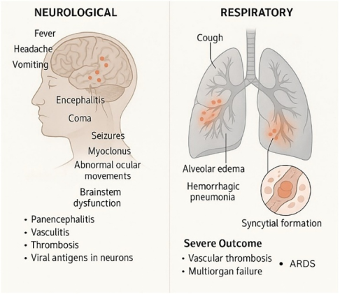 · 攻击重要器官:病毒直接攻击神经系统和呼吸系统,可引发致命性脑炎、急性呼吸窘迫综合征,导致多器官衰竭。