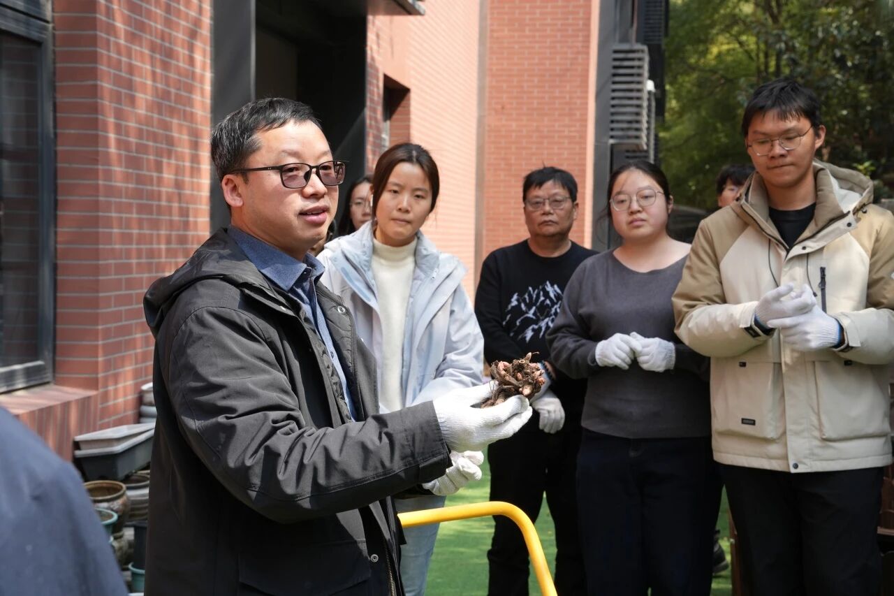 上海中医药大学百草园负责老师为师生讲解中医药文化和传统中药材特点