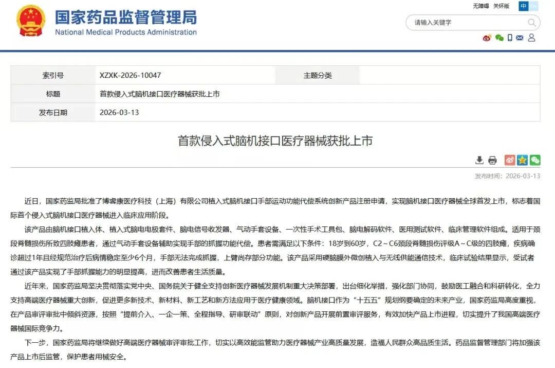 近日,国家药品监督管理局正式批准博睿康医疗科技(上海)有限公司植入式脑机接口手部运动功能代偿系统(NEO)创新产品注册申请。这是全球首个获批上市的植入式脑机接口三类医疗器械,标志着我国脑机接口技术逐步从实验室走向规模化临床应用,为全球神经疾病治疗提供了“上海方案”。