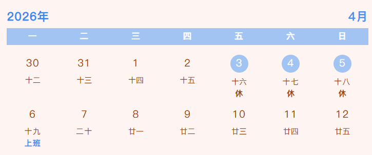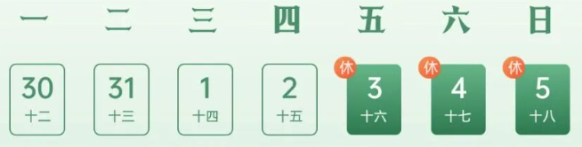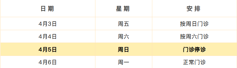 4月3日(周五)至5日(周日)放假,共3天,无门诊(互联网医院与线下门诊安排同步)。