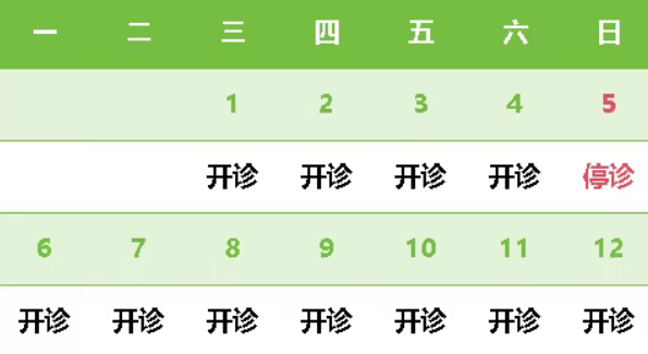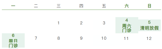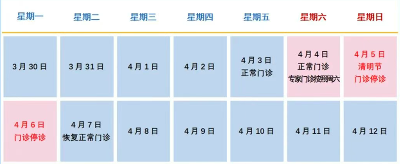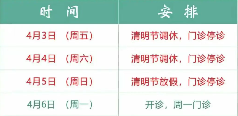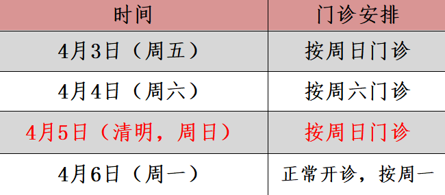 4月3日(周五)至5日(周日)共3天,放假,无门诊,4月6日(周一)上班,正常门诊。