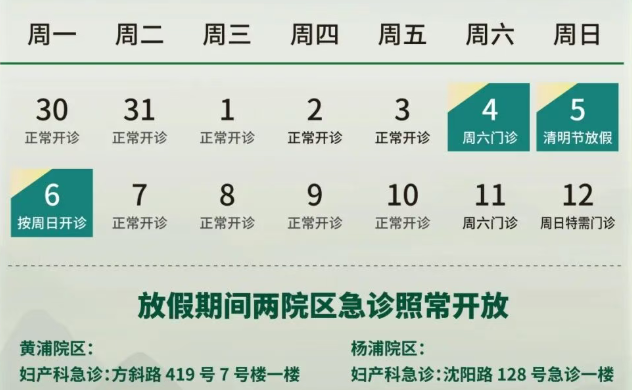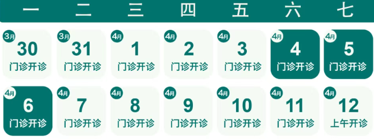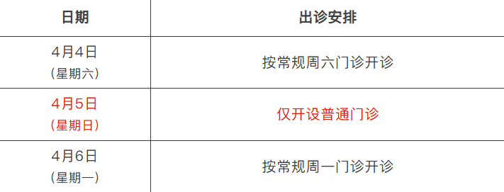 4月4日(周六)全天门诊,开诊科室同周六;4月5日(周日)