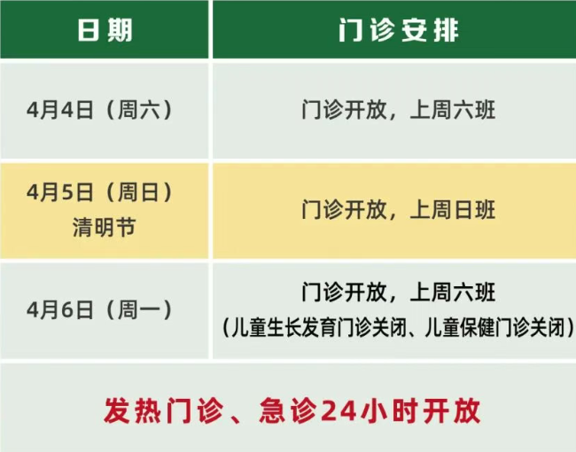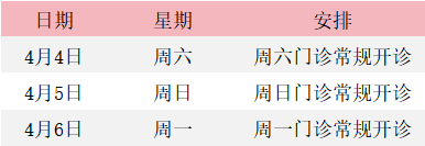 4月4日-4月6日互联网门诊正常开诊;急诊,发热门诊24小时开放;实行门诊预约制,