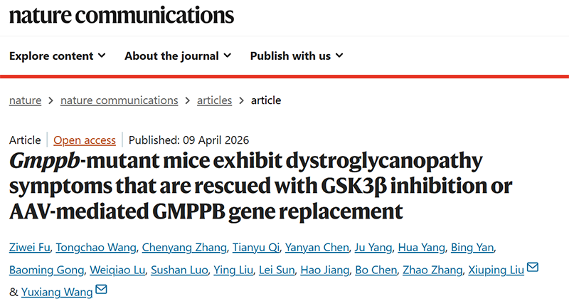 2026年4月9日,复旦大学基础医学院病理学系王宇翔团队联合多家单位,在《自然-通讯》(Nature Communications)上发表题为“Gmppb-mutant mice exhibit dystroglycanopathy symptoms that are rescued with GSK3β inhibition or AAV-mediated GMPPB gene replacement”的研究论文。该研究围绕GMPPB相关抗肌萎缩相关糖蛋白病(dystroglycanopathy)展开,系统解析了这一罕见神经肌肉疾病的发病机制,并提出了具有转化潜力的干预策略。值得一提的是,该论文同时入选Featured Article及Nature Collection: Muscle Biology,获得期刊专题页面重点展示和多次新闻报道。