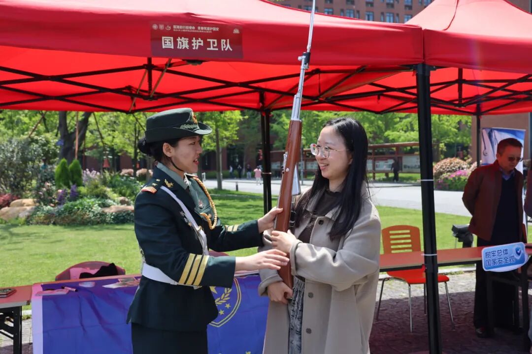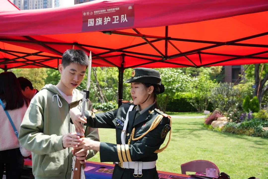 “力度要均匀,反应要迅速。”一旁国旗护卫队展位同样吸引了不少师生。护旗手身姿挺拔、神情肃穆,正手把手讲解护旗姿势,带领现场师生感受升旗仪式的神圣与庄严。