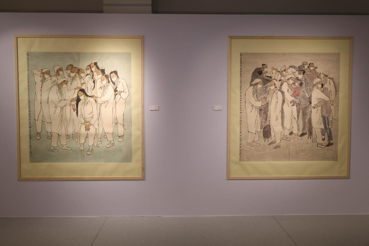 袁正宏代表主办方致辞并宣布画展开幕,何建华介绍画展策展初衷,顾平介绍为此次画展特别创作的以医学和上海医学院人物故事相关作品创作理念并对支持此次办展的各方表达感谢。开幕式上还举行了作品捐赠仪式。顾平向学校捐赠的山水作品一幅、《中国画院史》图书一套及相关专著。学校向资助此次展览举办的捐赠方企业家代表赠予捐赠证书,以感谢其对文明文化建设与美育事业的支持。为表感谢,顾平也同时向捐赠方代表捐赠书画和书法作品。