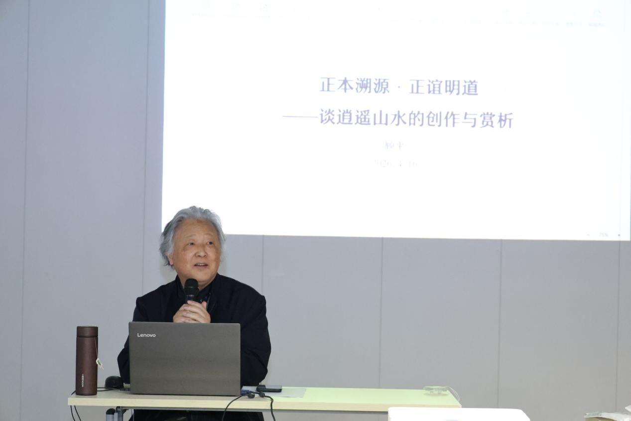 顾平以《“正本溯源 正谊明道”——逍遥山水中国画创作与赏析》为题,与师生同好面对面,开展专题座谈。他结合自己四十余年从艺历程,分享“逍遥山水”的创作脉络与精神内核。从少年墨缘守初心、溯文脉,到受六朝人文浸润立“逍遥画魂”,再以《竹林七贤》《兰亭修禊》《壶口旱地行船图》《雪霁太极图》《朝山图》等经典作品,阐释“正本溯源、正谊明道”的创作准则;以笔墨致敬医者,诠释艺与医“守仁心、行正道、担使命”的同源初心。座谈中,顾平分享了《中国画院史》等专著的编撰历程,传递以美育育人、续文脉薪火的艺术追求。